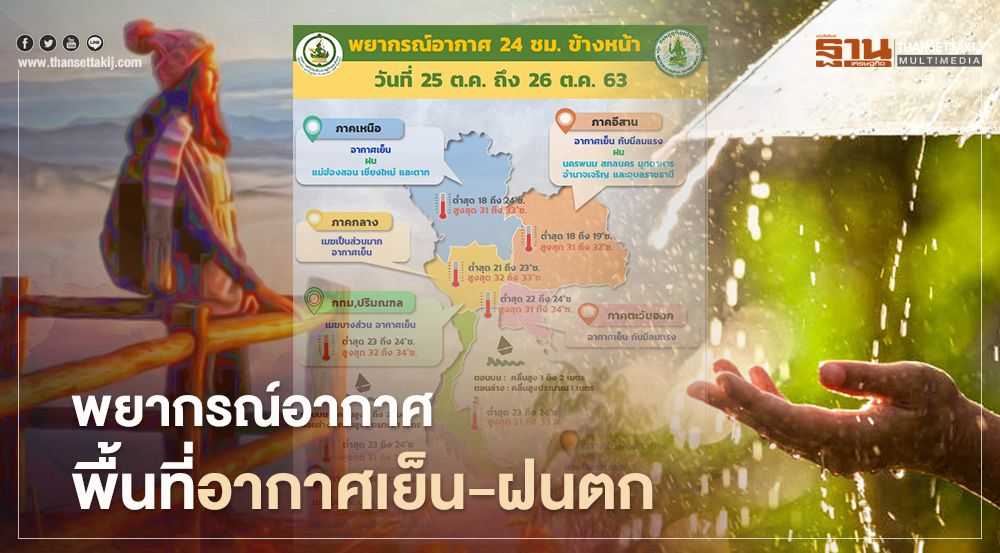 ผู้สื่อข่าวรายงานว่า กองพยากรณ์อากาศ กรมอุตุนิยมวิทยา กระทรวงดิจิทัลเพื่อเศรษฐกิจและสังคม เปิดเผย การพยากรณ์อากาศ 24 ชั่วโมง ข้างหน้า วันที่ 25-26 ต.ค. 63