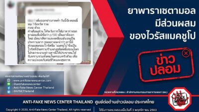 ศูนย์ต่อต้านข่าวปลอม ได้เปิดเผยว่า กรณีที่มีประเด็นข่าวเรื่อง "ยาพาราเซตามอลมีส่วนผสมของไวรัสแมคชูโป "นั้น ทางศูนย์ฯได้ดำเนินการตรวจสอบข้อเท็จจริงกับสำนักงานคณะกรรมการอาหารและยา (อย.) แล้วพบว่าประเด็นดังกล่าว เป็นข้อมูลเท็จ
