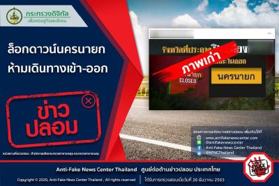 ตามที่มีการโพสต์และแชร์ข้อความ ล็อกดาวน์นครนายก ห้ามเดินทางเข้า-ออก ทางศูนย์ต่อต้านข่าวปลอมได้ตรวจสอบข้อเท็จจริงโดย สำนักงานปลัดกระทรวงสาธารณสุข กระทรวงสาธารณสุข พบว่าข้อมูลดังกล่าวนั้น เป็นข้อมูลเท็จ