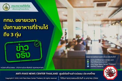ยืนยัน กทม.ขยายเวลานั่งทานอาหารที่ร้านได้ถึง 3 ทุ่ม เรื่องจริง