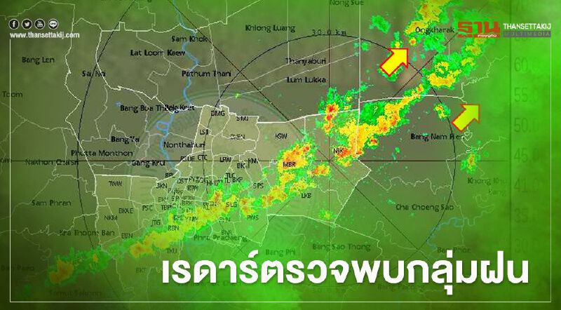 15.00 น. เรดาร์ กทม. ตรวจพบกลุ่มฝนเล็กน้อยถึงปานกลาง บริเวณจังหวัดนครนายก ฉะเชิงเทรา ปทุมธานี สมุทรปราการ สมุทรสาครและกรุงเทพมหานคร (เขตคลองสามวา ลาดกระบัง หนองจอก หนองแขม บางแค ทวีวัฒนา ตลิ่งชัน ภาษีเจริญ จอมทอง ธนบุรี คลองสาน บางรัก สาทร ห้วยขวาง) เคลื่อนตัวทางทิศตะวันออกเฉียงเหนือ เข้าสู่บริเวณจังหวัดนครนายก ปทุมธานี ฉะเชิงเทรา สมุทรปราการและกรุงเทพมหานคร (เขตบางกอกน้อย บางพลัด บางกอกใหญ่ ปทุมวัน ราชเทวี ลาดกระบัง หนองจอก)