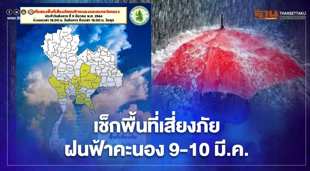 พื้นที่เสี่ยงภัยฝนฟ้าคะนอง - ลมกระโชกแรงวันที่ 9 - 10 มี.ค.