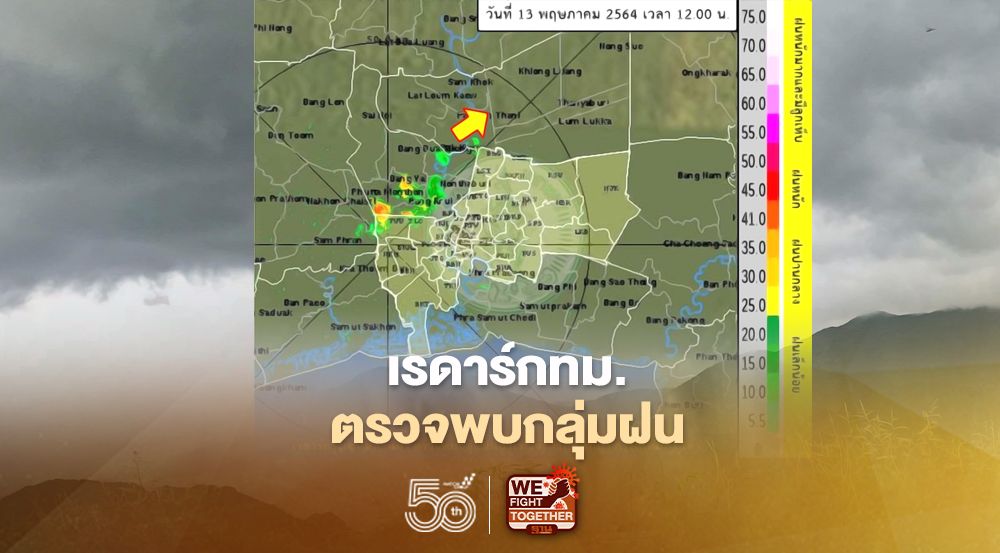 วันที่ 13 พฤษภาคม 2564 เวลา 16.00 น. เรดาร์กทม. ตรวจพบกลุ่มฝนเล็กน้อยถึงปานกลาง บริเวณจังหวัดปทุมธานี อยุธยาเคลื่อนตัวทางทิศตะวันออกเฉียงเหนือ แนวโน้มลดลง
