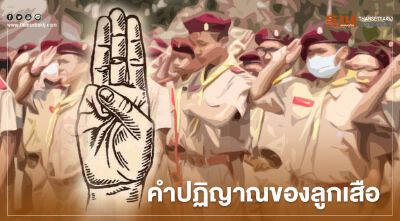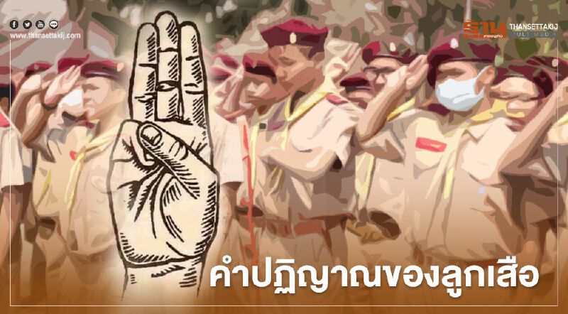 พร้อมกับอธิบายภาพการชูสามนิ้วว่า เป็น "คำปฏิญาณของลูกเสือ" 3 ด้วยเกียรติของข้าสัญญาว่า