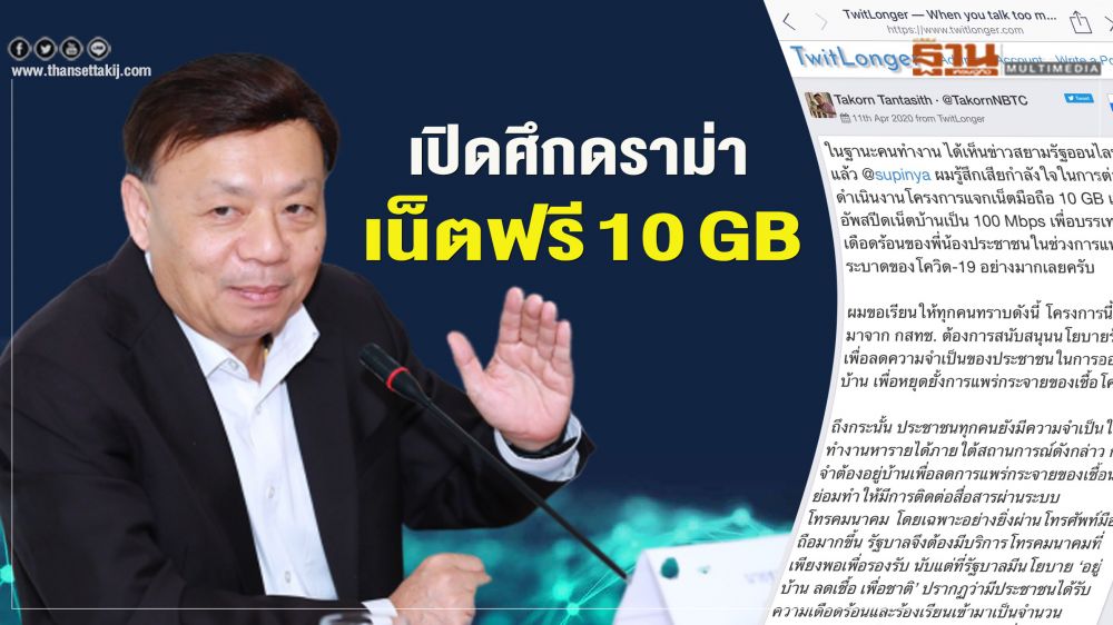 "ฐากร"แจงแจกเน็ตมือถือฟรี 10GB รับนโยบายรัฐ‘อยู่บ้าน ลดเชื้อ เพื่อชาติ’ สวนกลับ“สุภิญญา” ตั้งคำถามตีกิน ทำให้ประชาชนเข้าใจผิด ปัดเอื้อประโยชน์เอกชน