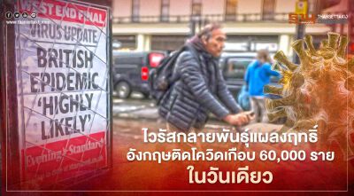 ไวรัสกลายพันธุ์พ่นพิษต่อเนื่องในอังกฤษ ทำยอดผู้ติดเชื้อใหม่รายวันทะยานเป็นประวัติการณ์เกือบ 60,000 ราย อย่างไรก็ตาม สธ.อังกฤษออกมาระบุว่า เชื้อดังกล่าวยังน่าหวาดกลัวน้อยกว่าไวรัสโควิดกลายพันธุ์ที่พบในแอฟริกา