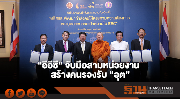 - 4 พ.ค. 61 - ผู้สื่อข่าวรายงานว่า สํานักงานเพื่อการพัฒนาระเบียงเศรษฐกิจภาคตะวันออก (สกรศ.) หรือ อีอีซี รุกหนักแผน ผลิตและพัฒนาคนเพื่อรองรับอุตสาหกรรมเป้าหมายในพื้นที่เเละมีการร่วมลงนามบันทึกความเข้าใจ (MOU) 4 ฉบับ กับ สํานักงานคณะกรรมการการอาชีวศึกษา (สอศ.) สํานักงานคณะกรรมการการอุดมศึกษา (สกอ.) และ สํานักงานคณะกรรมการส่งเสริมการลงทุน (สกอ.) หรือ บีโอไอ ด้วยแนวคิด “พัฒนา – เพิ่ม – สนับสนุน” โดยมีพระพรหมมังคลาจารย์ วัดไตรมิตรวิทยารามวรวิหาร (เจ้าคุณธงชัย) ร่วมอำนวยพรเเละเป็นสักขีพยานในการลงนามความร่วมมือของหน่วยงานดังกล่าวเพื่อความเป็นสิริมงคลในครั้งนี้