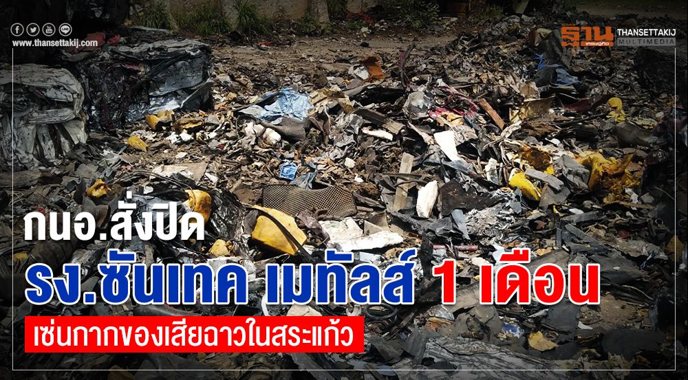 กนอ. สั่งปิด รง. ซันเทค เมทัลส์ ชั่วคราว 30 วัน ตาม พ.ร.บ. โรงงาน พ.ศ. 2535 เซ่นกากของเสียฉาวในสระแก้ว เผยเป็นต้นตอของกากของเสียมีการขนส่งของเสียไปยังปลายทางผู้รับดำเนินการที่ระยอง-ชลบุรี