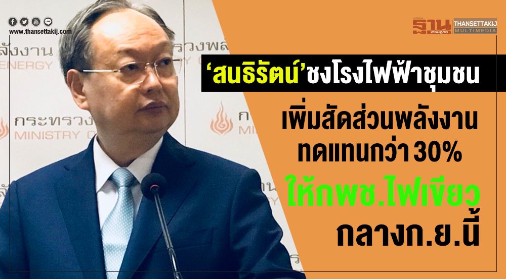 “สนธิรัตน์” เตรียมชง นโยบายให้ชุมชนมีส่วนร่วมผลิตไฟฟ้าจากพลังงานทดแทนหรือโรงไฟฟ้าชมุชน ให้กพช.พิจารณากลางก.ย.นี้ พร้อมเสนอปรับแผนพัฒนากำลังผลิตไฟฟ้าของประเทศ พ.ศ. 2561-2580(PDP 2018)ให้เพิ่มสัดส่วนการผลิตไฟฟ้าจากพลังงานทดแทนสูงขึ้นจาก 30 % ย้ำอยู่บนพื้นฐานค่าไฟฟ้าต้องถูกกว่าแผน PDP2018 ที่กำหนดไว้ 3.576 บาทต่อหน่วย ขณะที่เครือข่ายประชาชนปฏิรูปพลังงาน (คปพ.) ยื่นให้ปรับโครงสร้างพลังงานใหม่