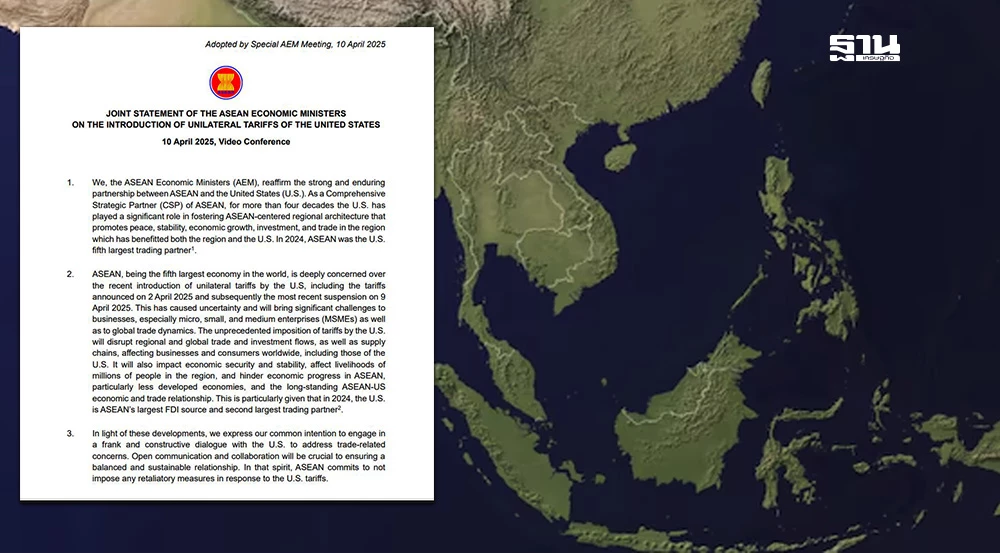 อาเซียน ซึ่งเป็นเศรษฐกิจใหญ่อันดับห้าของโลก มีความกังวลอย่างยิ่งเกี่ยวกับการประกาศใช้ภาษีฝ่ายเดียวโดยสหรัฐฯ เมื่อเร็วๆ นี้ รวมถึงภาษีที่ประกาศเมื่อวันที่ 2 เมษายน 2568 และการระงับล่าสุดเมื่อวันที่ 9 เมษายน 2568 สิ่งนี้ได้สร้างความไม่แน่นอนและจะนำมาซึ่งความท้าทายที่สำคัญต่อภาคธุรกิจ โดยเฉพาะวิสาหกิจขนาดจุลภาค ขนาดย่อม และขนาดกลาง (MSMEs) ตลอดจนพลวัตการค้าโลก การเรียกเก็บภาษีโดยสหรัฐฯ ที่ไม่เคยเกิดขึ้นมาก่อนนี้จะส่งผลกระทบต่อการค้าระดับภูมิภาคและระดับโลก ตลอดจนกระแสการลงทุนและห่วงโซ่อุปทาน ซึ่งส่งผลต่อธุรกิจและผู้บริโภคทั่วโลก รวมถึงธุรกิจและผู้บริโภคในสหรัฐฯ เอง นอกจากนี้ ยังจะส่งผลกระทบต่อความมั่นคงและเสถียรภาพทางเศรษฐกิจ กระทบต่อการดำรงชีวิตของประชาชนนับล้านในภูมิภาค และขัดขวางความก้าวหน้าทางเศรษฐกิจในอาเซียน โดยเฉพาะในเศรษฐกิจที่พัฒนาน้อยกว่า รวมถึงความสัมพันธ์ทางเศรษฐกิจและการค้าระหว่างอาเซียนและสหรัฐฯ ที่มีมายาวนาน โดยเฉพาะอย่างยิ่งเมื่อพิจารณาว่าในปี 2567 สหรัฐฯ เป็นแหล่งการลงทุนโดยตรงจากต่างประเทศรายใหญ่ที่สุดของอาเซียนและเป็นคู่ค้ารายใหญ่อันดับสองของอาเซียน