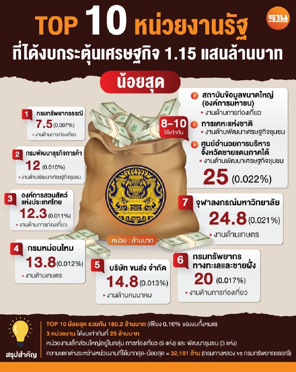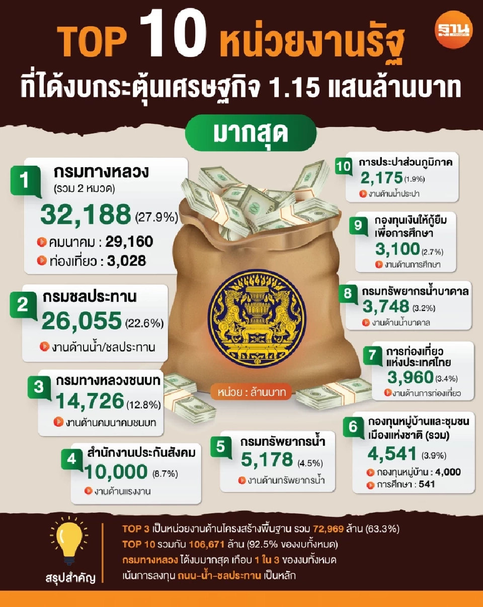 ฐานเศรษฐกิจ ตรวจสอบรายละเอียดเชิงลึกถึงรายละเอียดงบกระตุ้นเศรษฐกิจ ก้อนมหึมากว่าแสนล้าน พบว่าได้กระจายลงไปยังหน่วยงานต่าง ๆ ใน 4 ด้าน แยกเป็นรายหน่วยงาน และวงเงินที่ได้รับการจัดสรร สรุปได้ดังนี้