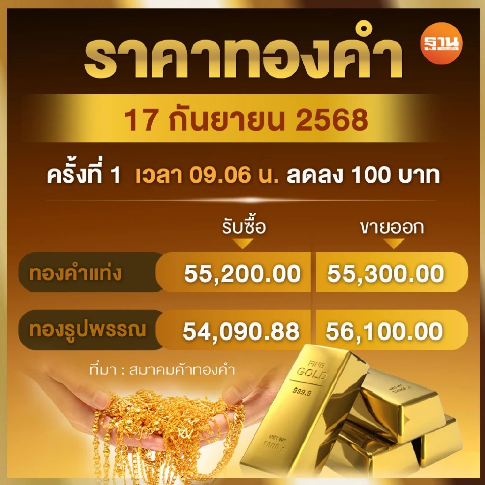 ราคาทองวันนี้ 17 ก.ย.2568 เวลา 09.06 น. (ครั้งที่ 1) เปิดตลาดราคาทองปรับลดลง 100 บาท ส่งผลให้ราคาทองคำแท่ง และ ทองรูปพรรณ มีราคาดังนี้