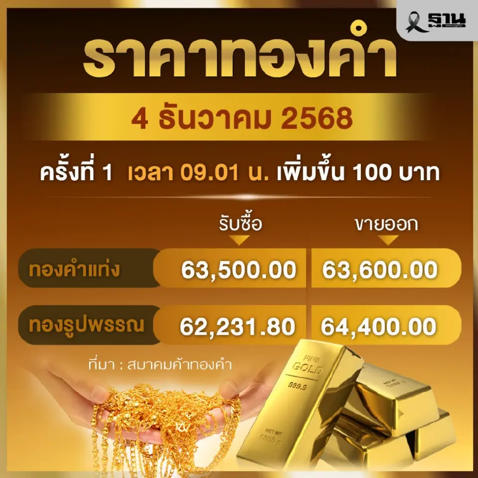 ราคาทองวันนี้ 4 ธ.ค.2568 ราคาทองปรับเพิ่มขึ้น 100 บาท ทองรูปพรรณขายออก 64,400 บาท
