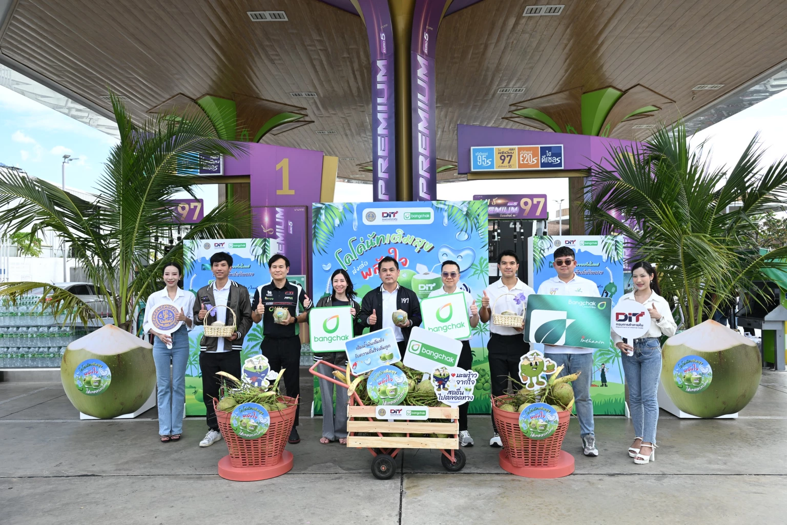 กรมฯ จึงได้เร่งหาช่องทางการตลาดเพิ่มเติมโดยได้รับความร่วมมือจากสถานีบริการน้ำมันเชื้อเพลิง 4 ราย ได้แก่ พีที โออาร์ บางจาก และซัสโก้ ช่วยดูดซับผลผลิตมะพร้าวน้ำหอมจากเกษตรกรในพื้นที่ จ.ราชบุรี จาก 4 ตำบล 2 อำเภอ ประกอบด้วย ต.ดอนกรวย ต.แพงพวย อ.ดำเนินสะดวก และ ต.บางแพ ต.โพธิ์หัก อ.บางแพ และนำมาควั่นเขียว จำนวน 80,000 ลูก เพื่อนำมาแจกเป็นของสมนาคุณให้แก่ผู้ที่มาเติมน้ำมัน โดยเริ่มแจกตั้งแต่วันที่ 4-6 ธ.ค.2568 รวมระยะเวลา 3 วัน หรือจนกว่าของจะหมด จำนวน 547 สาขา ครอบคลุมพื้นที่ 8 จังหวัด ในพื้นที่กรุงเทพ ปริมณฑล และจังหวัดใกล้เคียง (นนทบุรี ปทุมธานี นครปฐม สมุทรปราการ สมุทรสงคราม สมุทรสาคร ฉะเชิงเทรา)