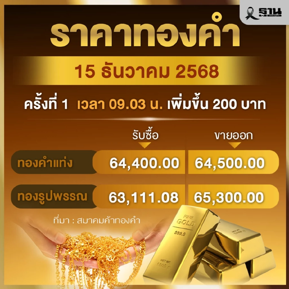 ราคาทองวันนี้ 15 ธ.ค.2568 เวลา 09.03 น. (ครั้งที่ 1) ราคาทองเปิดตลาดปรับเพิ่มขึ้น 200 บาท ส่งผลให้ราคาทองคำแท่งและทองรูปพรรณ มีราคาดังนี้