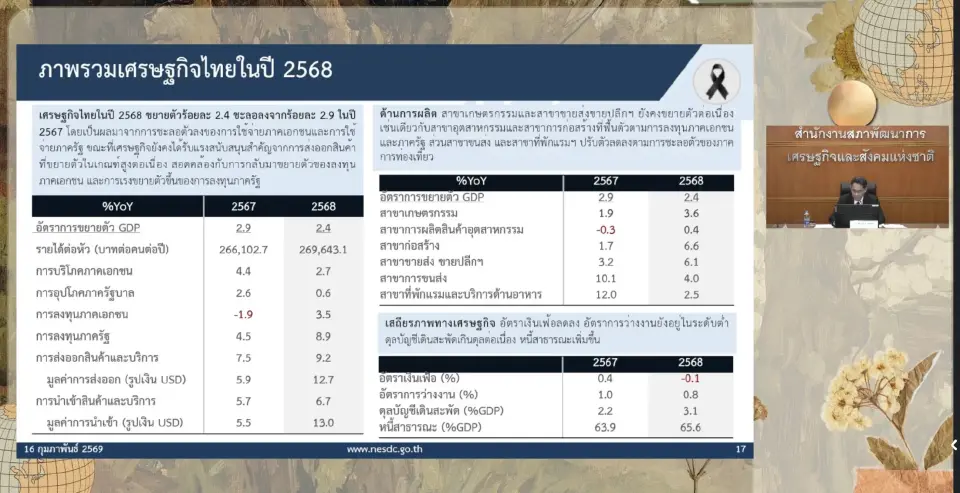 16 กุมภาพันธ์ 2569 นายดนุชา พิชยนันท์ เลขาธิการสภาพัฒนาการเศรษฐกิจและสังคมแห่งชาติ (สศช.) เปิดเผยรายงานภาวะเศรษฐกิจไทยไตรมาสที่ 4 ของปี 2568 และแนวโน้มปี 2569 ว่า เศรษฐกิจไทยไตรมาสที่ 4 ปี 2568 ผลิตภัณฑ์มวลรวมภายในประเทศ (GDP) ขยายตัว 2.5% ส่งผลให้ทั้งปี 2568 เศรษฐกิจไทยขยายตัว 2.4% เพิ่มขึ้นจากเป้าหมายเดิมที่คาดว่าจะขยายตัวเพียง 2%