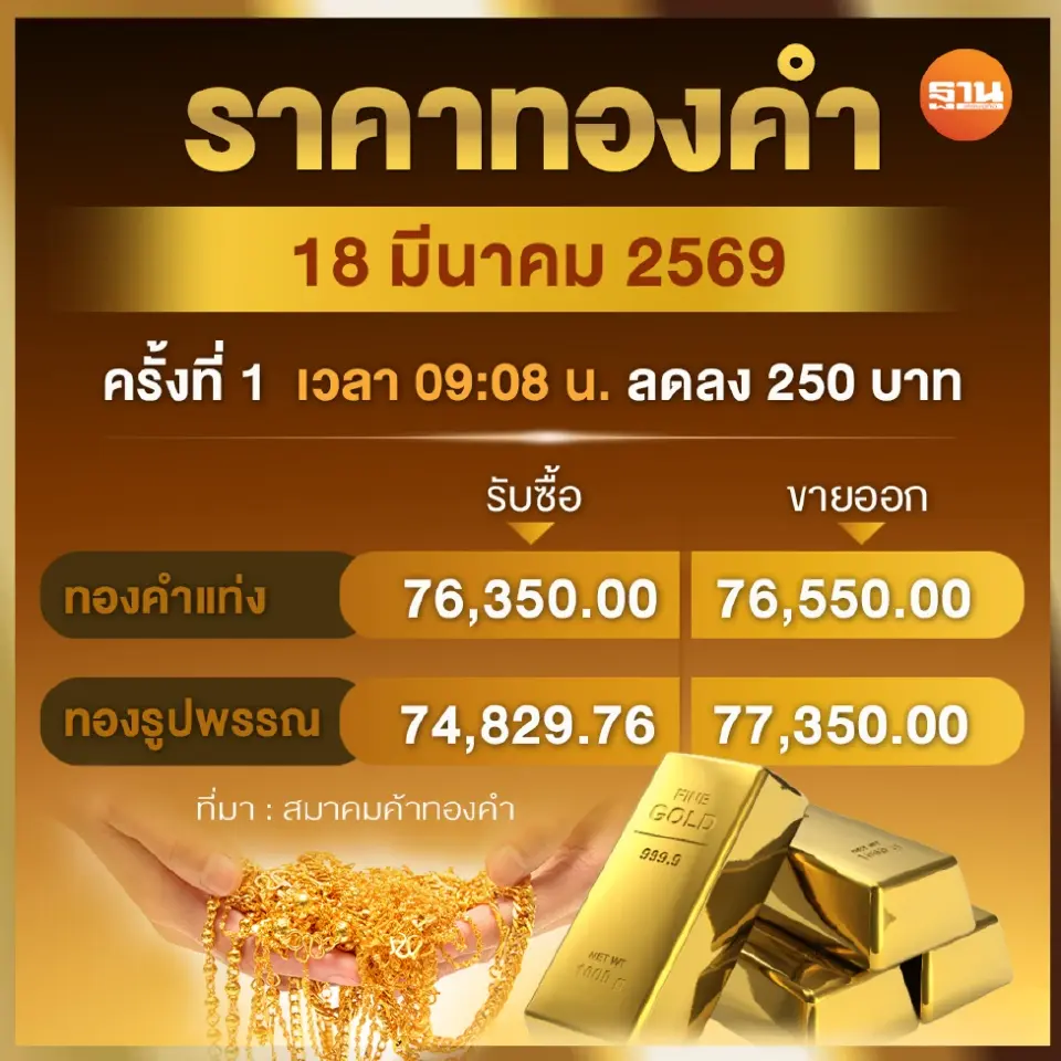 ราคาทองวันนี้ 18 มีนาคม 2569 เปิดตลาดร่วง 250 บาท ทองรูปพรรณขายออก 77,350 บาท
