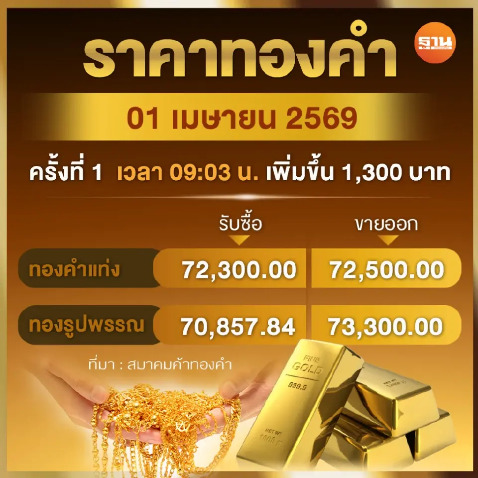 ราคาทองวันนี้ 1 เม.ย.2569 ราคาทองเปิดตลาดราคาปรับเพิ่มขึ้น 1,300 บาท ส่งผลให้ราคาทองคำแท่งขายออกอยู่ที่ราคา 72,500 บาท ราคาทองรูปพรรณขายออกอยู่ที่ 73,300 บาท