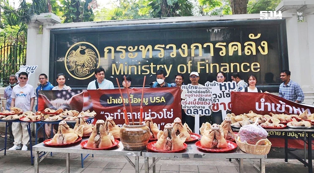 วันนี้ (10 เม.ย.68) กลุ่มเกษตรกรผู้เลี้ยงหมูกว่า 1,000 คน เดินทางมายังกระทรวงการคลัง-หอการค้าไทยฯ ยื่นหนังสือขอความเห็นใจ พร้อมนำหัวหมู 37 หัว บนบานกู้วิกฤต หลังประธานาธิบดีโดนัลด์ ทรัมป์ ขู่เรียกเก็บภาษีนำเข้าจากไทย 37% เพื่อลดการขาดดุลการค้า และรัฐบาลไทยเตรียมเจรจาเปิดทางนำเข้าเครื่องในหมูสหรัฐฯ ซึ่งจะกระทบอาชีพเกษตรกรผู้เลี้ยงหมู และห่วงโซ่การผลิตทั้งหมดที่มีมูลค่ากว่า 3 แสนล้านบาท