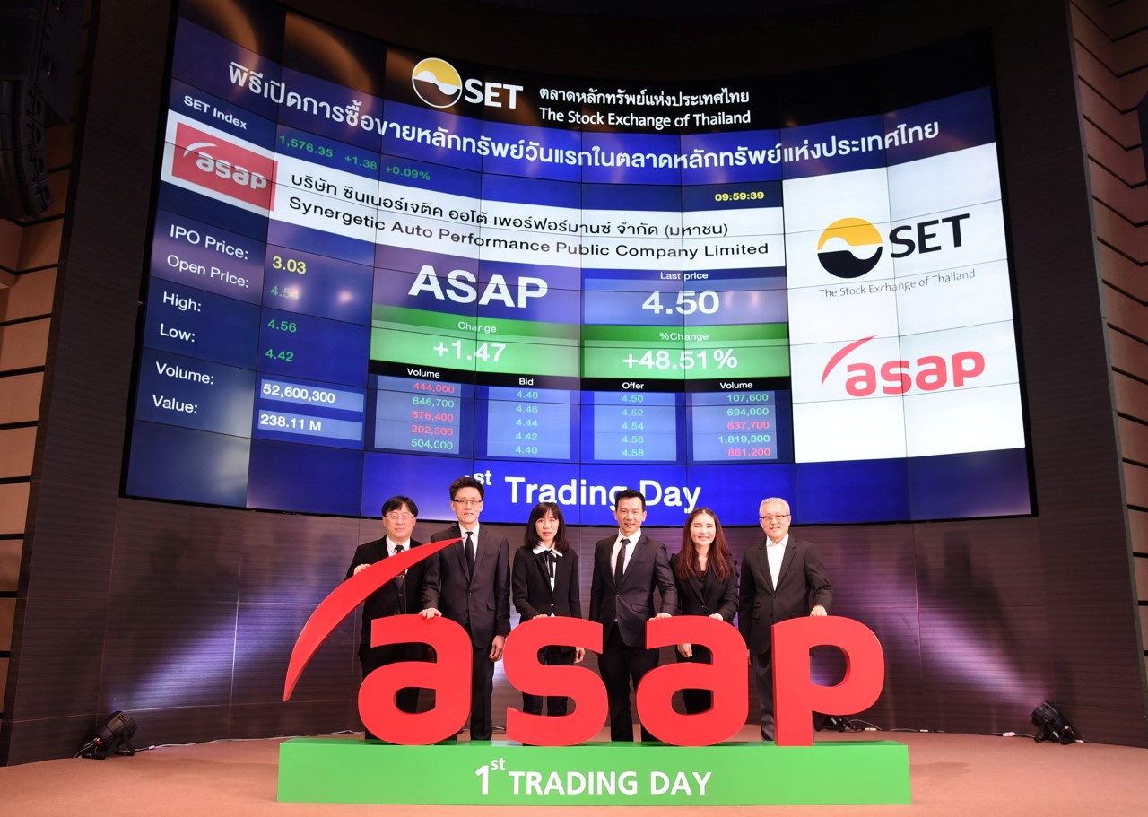หุ้นบริษัท ซินเนอร์เจติค ออโต้ เพอร์ฟอร์มานซ์ จำกัด (มหาชน) หรือ ASAP ประกอบธุรกิจรถยนต์ให้เช่าภายใต้แบรนด์ asap เข้าซื้อขายในตลาดหลักทรัพย์แห่งประเทศไทย วันที่ 30 มี.ค.60 เป็นวันแรก ปิดตลาดที่ 4.34 บาท เพิ่มขึ้น 1.31 บาท สูงกว่าราคาจอง 43.23% จากราคาไอพีโอ IPO ที่ 3.03 บาท โดยมีมูลค่าการซื้อขาย 1,576.87 ล้านบาท