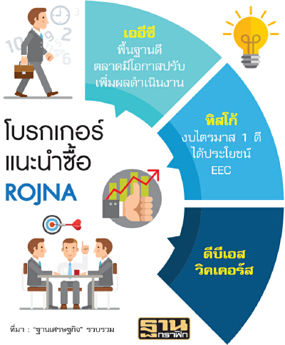 นักวิเคราะห์บริษัทหลักทรัพย์ทิสโก้ ยังคงแนะนำ”ซื้อ”หุ้น ROJNA โดยมีมูลค่าที่เหมาะสมที่ 7.20 บาท คาดไตรมาส 1/2560 ผลการดำเนินงานเติบโต 39% จากช่วงเดียวกันปีก่อนและเพิ่มขึ้นถึง 7 เท่าจากไตรมาส4/2559 เนื่องมาจากยอดโอนที่ดินและการขายไฟที่เพิ่มขึ้น ทั้งนี้ ธุรกิจโรงไฟฟ้าเป็นตัวทำรายได้ และกำไรก่อนภาษี ดอกเบี้ยและค่าเสื่อม(อิบทดา)หลักผลประกอบการจะเพิ่มขึ้นสูงในช่วงครึ่งปีหลังเป็นต้นไป เนื่องมาจากการดำเนินงานของโรงไฟฟ้า SPP 3 แห่งในเดือน กรกฎาคม และมีนิคม 2 แห่งรองรับการเปิด EEC ที่บ่อวินและแหลมฉบัง