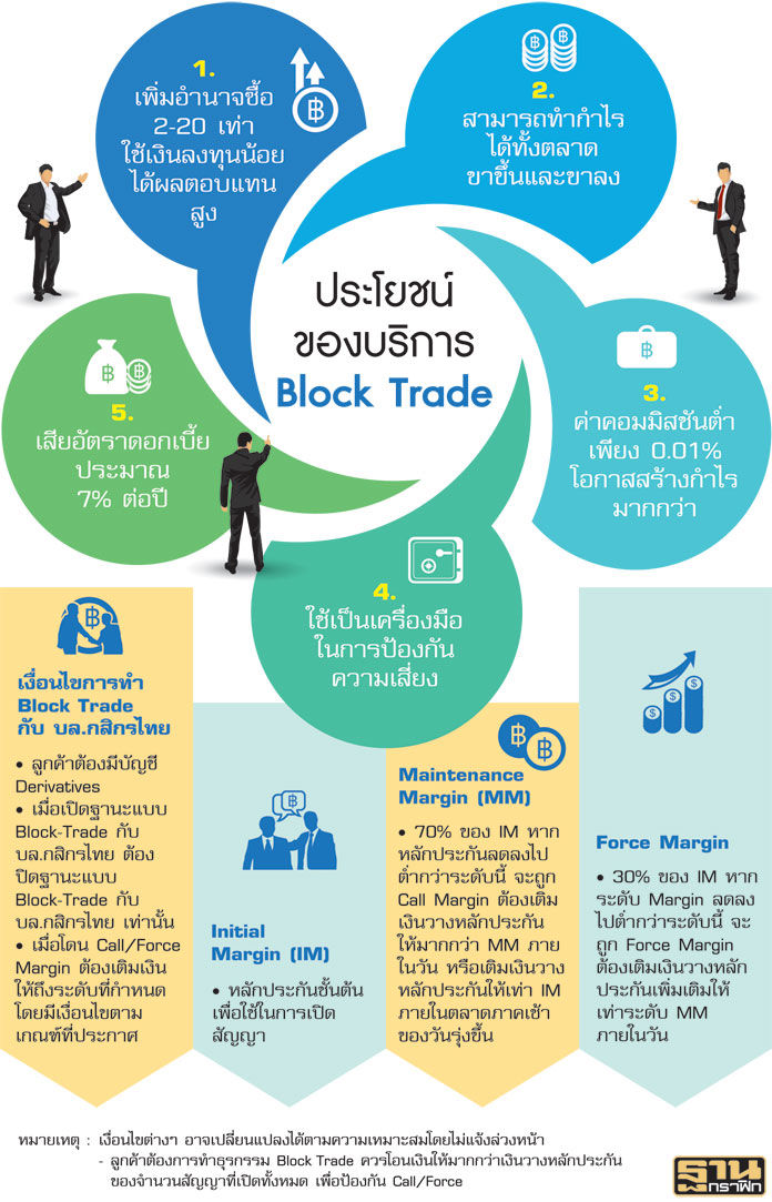 “ ปกติกรณีลูกค้าต้องการลงทุนหุ้นบริษัทปตท. (PTT) จำนวน 1,000 หุ้น ในราคาหุ้นละประมาณ 400 บาท จะต้องใช้เงินลงทุนจำนวน 4 แสนบาท แต่หากซื้อแบบBlock Trade ตามข้อกำหนดของ TFEX ให้หุ้นปตท.ซื้อขายขั้นต่ำ 20 สัญญา ลูกค้าจะสามารถลงทุนได้ถึง 2 หมื่นหุ้น คิดเป็นมูลค่า 8 ล้านบาท เพียงวางเงิน 10% คิดเป็น 8 แสนบาทเป็นหลักประกันเท่านั้น โดยที่บริษัทหลักทรัพย์กสิกรไทยออกเงินจำนวนมากซื้อหุ้นส่วนเกิน จำนวน 1.9 หมื่นหุ้นให้ลูกค้าก่อน บางครั้งราคาขึ้นหรือ ลงเพียง 2 ช่อง ก็ทำกำไรได้แล้ว ถือลงทุนนานแค่ไหนก็ได้ โดยสามารถใช้เป็นเครื่องมือในการบริหารความเสี่ยงได้เพราะเล่นได้ทั้งราคาขาขึ้นและขาลง “ นายสุทธิสิทธิ์กล่าว