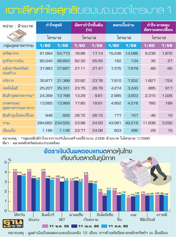 ตลาดหลักทรัพย์แห่งประเทศไทย (ตลท.) เปิดเผยว่า ผลการดำเนินงานงวดไตรมาสที่ 1/2560 ของบริษัทจดทะเบียน(บจ.)ในตลาดหลักทรัพย์(SET) มีกำไรสุทธิทั้งสิ้น 284,662 ล้านบาท เติบโตประมาณ 21%มาจากการดำเนินงานปกติที่เพิ่มขึ้นไม่มากนัก อาทิ ยอดขายรวมจำนวน 2,705,102 ล้านบาท ขยายตัว 13.28% จากระยะเดียวกันของปีก่อนที่มียอดขาย 2,388,007 ล้านบาท