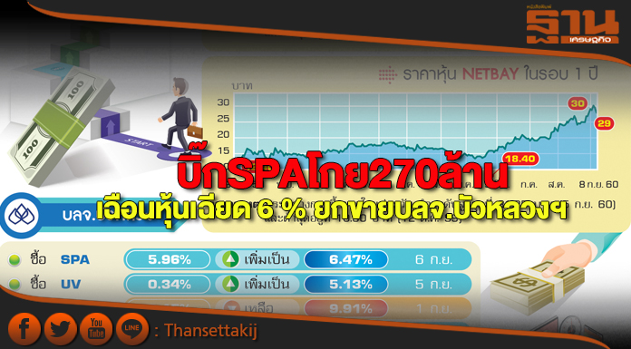 4 ผู้ถือหุ้นใหญ่ และผู้บริหาร บริษัท สยามเวลเนสกรุ๊ป จำกัด (มหาชน) หรือ SPA รายงานข้อมูล ต่อสำนักงานคณะกรรมการกำกับหลักทรัพย์และตลาดหลักทรัพย์(ก.ล.ต.) ว่าได้ขายหุ้นยกล็อตจำนวน 20 ล้านหุ้น ให้บริษัทหลักทรัพย์จัดการกองทุนรวม (บลจ.)บัวหลวง ในราคาหุ้นละ 13.50 บาท รวมเป็นเงินทั้งสิ้น 270 ล้านบาท เมื่อวันที่ 6 กันยายน 2560 ที่ผ่านมา