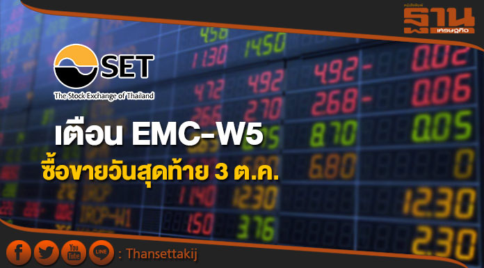 ตลาดหลักทรัพย์ฯ เตือนผู้ลงทุน เปิดให้ซื้อขาย EMC-W5 วันสุดท้าย 3 ต.ค. และพ้นสภาพเป็นหลักทรัพย์จดทะเบียน 31 ต.ค.นี้