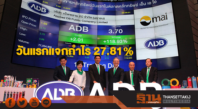หุ้นน้องใหม่ ADB เปิดตัวแรงราคาทะยาน 118% ก่อนถูกเทขายทำกำไร ราคาปิดวันแรกเพิ่มขึ้น 47 สตางค์จากไอพีโอหุ้นละ 1.69 บาท