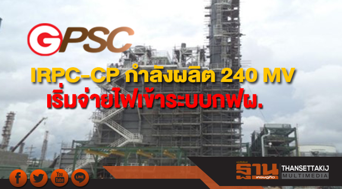 บริษัท โกลบอล เพาเวอร์ ซินเนอร์ยี่ จำกัด (มหาชน) หรือ GPSC แจ้งว่า เมื่อวันที่ 15 พ.ย.2560 บริษัท ไออาร์พีซี คลีน พาวเวอร์ จำกัด (IRPC-CP) โรงไฟฟ้าผู้ผลิตไฟฟ้ารายเล็ก กำลังการผลิตติดตั้งรวม 240 เมกะวัตต์ ไอน้ำ 180-300 ตันต่อชั่วโมง ที่บริษัทฯ ได้เข้าถือหุ้นในสัดส่วนร้อยละ 51 เริ่มเปิดดำเนินการเชิงพาณิชย์ในระยะที่ 2 คิดเป็นกำลังการผลิตติดตั้ง จำนวน 195 เมกะวัตต์หรือเป็นกำลังการผลิตตามสัดส่วนการลงทุนในระยะที่ 2 จำนวน 99.4 เมกะวัตต์ ได้เดินเครื่องจ่ายไฟฟ้าเข้าระบบโครงข่ายไฟฟ้าของการไฟฟ้าฝ่ายผลิตแห่งประเทศไทยแล้ว