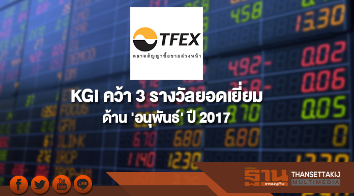 TFEX ประกาศรางวัล TFEX Best Awards 2017 แก่โบรกเกอร์ที่มีผลงานโดดเด่น โดย บล. เคจีไอ คว้า 3 รางวัลยอดเยี่ยม ได้แก่ รางวัล Most Active House, Most Active Agent และรางวัล market maker ยอดเยี่ยม ประเภท equity futures ในขณะที่ บล. ภัทร คว้ารางวัลยอดเยี่ยมด้าน prop-trade สำหรับ market maker ยอดเยี่ยมประเภทอื่น มอบแก่ บล. กสิกรไทย (equity options) บ. เอ็มทีเอส โกลด์ ฟิวเจอร์ (precious metal) บ. วงศ์บัณฑิต (agriculture) และ ธ. กรุงไทย (currency)