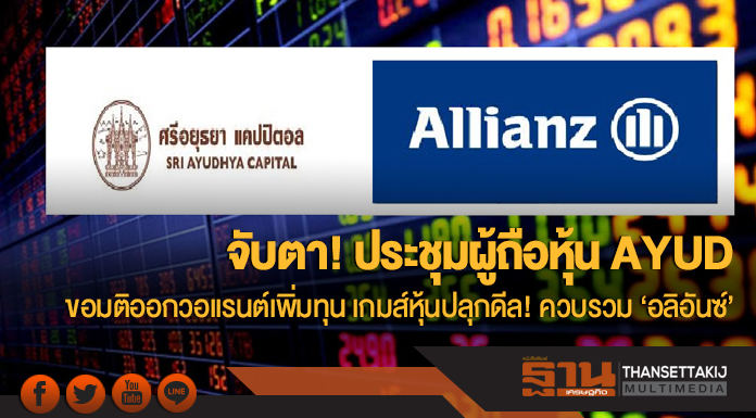 บมจ.ศรีอยุธยา แคปิตอล หรือ AYUD จะมีการประชุมสามัญผู้ถือหุ้นประจำปีในวันที่ 20 เม.ย. 2561 เพื่อขออนุมัติให้ออกใบสำคัญแสดงสิทธิที่จะซื้อหุ้นสามัญใหม่โดยไม่คิดมูลค่า (Free Warrant) ให้กับผู้ถือหุ้นทุกรายในสัดส่วน 2 หุ้นเดิมต่อ 1 Free Warrant หลังจากที่ประชุมที่ประชุมวิสามัญผู้ถือหุ้นครั้งที่ 1/2561 เมื่อวันที่ 19 ม.ค. ได้พิจารณาให้ บริษัท ศรีอยุธยา เจนเนอรัล ประกันภัย (บริษัทลูก) ซื้อและรับโอนกิจการทั้งหมดจาก บริษัท อลิอันซ์ ประกันภัย