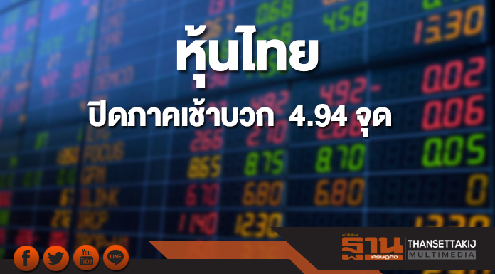 ตลาดหุ้นไทยปิดการซื้อขายภาคเช้าวันที่30 เมษายน 2561 เพิ่มขึ้น 4.94จุด หรือ +0.28% ดัชนีอยู่ที่ 1,782.96 จุด มูลค่าซื้อขาย 23,838.38 ล้านบาท