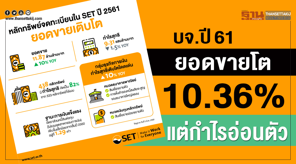 หลักทรัพย์จดทะเบียนในตลาดหลักทรัพย์แห่งประเทศไทย รายงานยอดขายปี 2561 รวม 11.87 ล้านล้านบาท เพิ่มขึ้น 10.36% จากปีก่อน แต่มีกำไรสุทธิรวม 9.31 แสนล้านบาท ลดลง 1.45% เนื่องจากในไตรมาส 4/2561 หมวดธุรกิจที่เกี่ยวข้องกับราคาสินค้าโภคภัณฑ์มีกำไรสุทธิลดลงจากการปรับลดมูลค่าสินค้าคงคลัง ตามทิศทางราคาน้ำมัน ผลิตภัณฑ์ปิโตรเคมีภัณฑ์ และเหล็ก