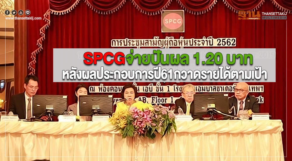 มติที่ประชุมสามัญผู้ถือหุ้น SPCG อนุมัติจ่ายปันผล 1.20 บาท หลังผลประกอบการปี 2561 กวาดรายได้ตามเป้า พร้อมลุยธุรกิจ 2562 ต่อเนื่องตั้งเป้ากวาดรายได้เพิ่ม 7 พันล้าน จาก 2 ธุรกิจหลัก จัดแพ็คเกจขานรับนโยบายโซลาร์รูฟภาคประชาชน
