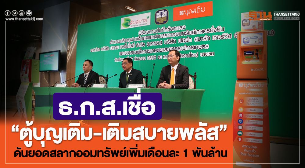 ธ.ก.ส. จับมือ บุญเติม เเละ เติมสบายพลัส เป็นตัวแทนธนาคาร บริการ 180,000 จุดทั่วประเทศ เชื่อทำยอดฝากสลากออมทรัพย์เกษตรยั่งยืนเพิ่มเดือนละ 1,000 ลบ.ได้ 24 เดือน ฝากครบ 10,000 ลบ.ตามเป้าแน่