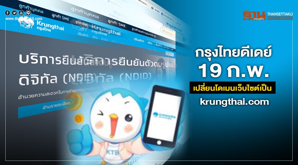 ธนาคารกรุงไทยเปลี่ยนชื่อโดเมนเว็บไซต์องค์กรใหม่จาก ktb.co.th เป็น krungthai.com ซึ่งสามารถใช้งานในชื่อโดเมนใหม่ได้ตั้งแต่วันที่ 19 กุมภาพันธ์นี้เป็นต้นไป เพื่อแสดงถึงเอกลักษณ์และสามารถบ่งบอกความเป็นกรุงไทยได้ชัดเจน ไม่ต้องจดจำชื่อย่อ เป็นสากลและสามารถต่อยอดธุรกรรมได้อย่างไร้ขีดจำกัด พร้อมปรับโฉมให้ผู้ใช้งานเข้าถึงข้อมูลทางการเงินแบบไร้ขีดจำกัด ทันสมัย ใช้งานง่ายรองรับทุกอุปกรณ์ใช้งาน