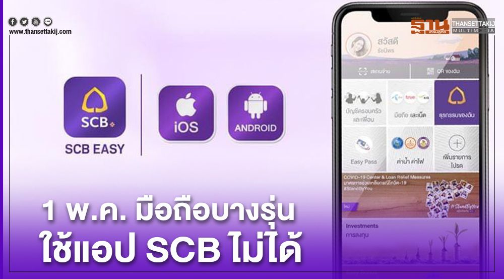 ธนาคารไทยพาณิชย์ ขอเรียนให้ทราบว่า ตั้งแต่วันที่ 1 พฤษภาคม 2563 เป็นต้นไป ลูกค้าที่ใช้แอป SCB EASY ในระบบปฏิบัติการ iOS รุ่นที่ต่ำกว่า 10.3.4 และ Android รุ่นที่ต่ำกว่า 6.0 รวมถึงอุปกรณ์มือถือเครื่องมืออิเล็กทรอนิกส์ของท่านที่มีการ Root/Jailbreak จะไม่สามารถใช้งานแอป SCB EASY ได้อีกต่อไป