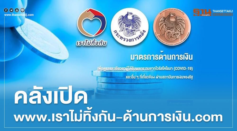 กระทรวงการคลัง เปิดตัวเว็บไซต์ www.เราไม่ทิ้งกัน-ด้านการเงิน.com รวมทุกมาตรการด้านการเงินดูแลเยียวยาผู้ที่ได้รับผลกระทบโควิด-19 ของสถาบันการเงินของรัฐทุกแห่ง เริ่ม 25 พ.ค. เพื่อเป็นการต่อยอดมาตรการเยียวยา หลังจากที่กระทรวงการคลัง ออกมาตรการเยียวยาผู้ที่ได้รับผลกระทบจากโควิด-19 รายละ 5,000 บาท โดยลงทะเบียนผ่าน www.เราไม่ทิ้งกัน.com ซึ่งจะปิดรับสิทธิ์ในวันที่ 29 พ.ค.