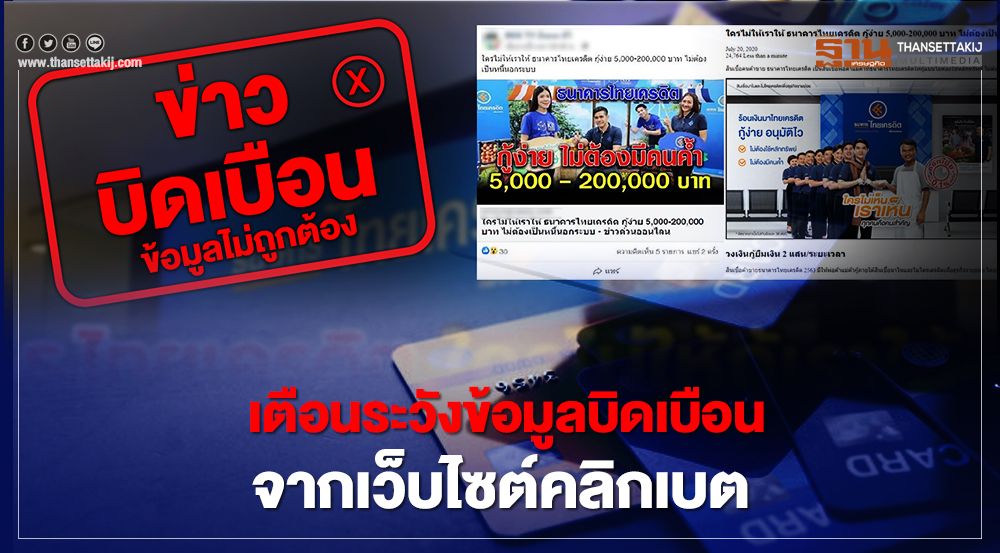 นายรอย ออกุสตินัส กุนารา กรรมการผู้จัดการ ธนาคารไทยเครดิต เพื่อรายย่อย จำกัด (มหาชน) แจ้งว่า ขณะนี้มีเว็บไซต์คลิกเบต (เว็บไซต์ที่พาดหัวแบบเร้าใจ ใช้ประโยชน์จากความสงสัยดึงดูดให้คลิกเข้าไปชมทันทีโดยไม่คำนึงถึงคุณภาพหรือความถูกต้องของข้อมูล) และเพจเฟซบุ๊กบางเพจให้ข้อมูลเกี่ยวกับผลิตภัณฑ์และบริการของธนาคารคลาดเคลื่อนจากความเป็นจริง โดยไม่ผ่านหน่วยงานข้อมูลข่าวสารอย่างเป็นทางการของธนาคาร สร้างความสับสน และความเข้าใจผิดให้แก่ผู้สนใจสินเชื่อ รวมถึงลูกค้าของธนาคาร