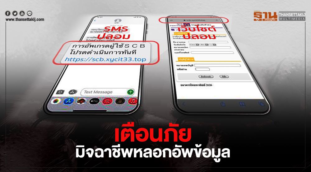 ช่วงนี้มีมิจฉาชีพปลอมตัวเป็นธนาคารต่างๆ ส่ง SMS ปลอม เช่น ใช้ชื่อผู้ส่งเป็น SCB หรือ 027777777 และอาจส่งมาในกล่องข้อความที่ท่านเคยได้รับจากธนาคาร มีข้อความกระตุ้นให้คลิก เช่น “อัปเกรดระบบผู้ใช้งาน” พร้อมมีลิงก์ไปยังเว็บไซต์ปลอม เพื่อหลอกขอข้อมูลที่สำคัญของท่าน