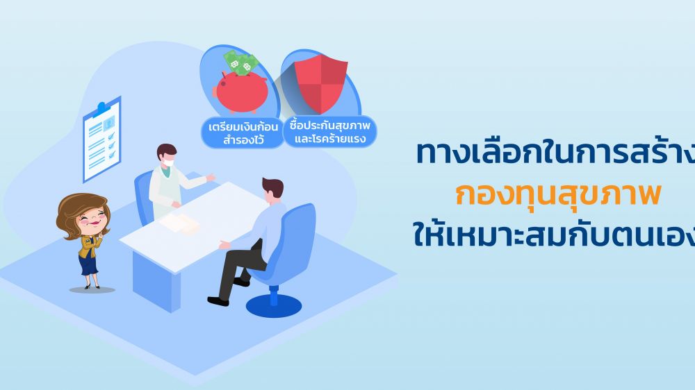 ทางเลือกแรก “เตรียมเงินก้อนสำรองไว้” เพื่อใช้เป็นค่าใช้จ่ายในกรณีเจ็บป่วย ซึ่งเงินก้อนนี้ อาจมาจากการเก็บสะสม หรือการได้รับเงินก้อนพิเศษ (เช่น โบนัส) จากการทำงาน มรดก หรือการทำธุรกิจใดๆ ซึ่งแน่นอนว่า ระยะเวลาในการเก็บออมและจำนวนเงินที่ต้องเตรียมนั้นอาจไม่เท่ากันในแต่ละคน แนะนำให้พิจารณาจากประวัติการรักษาในช่วง 5 ปีที่ผ่านมา ร่วมกับประวัติการเจ็บป่วยของคนในครอบครัว เช่น คุณพ่อ คุณแม่ หรือญาติผู้ใหญ่ ยกตัวอย่างเช่น คุณสมชายเป็นคนที่ชอบออกกำลังกายอย่างสม่ำเสมอ ไม่เคยเจ็บป่วยด้วยโรครุนแรงจนต้องนอนโรงพยาบาลในช่วง 5 ปีที่ผ่านมา แต่คุณพ่อเสียชีวิตด้วยโรคมะเร็งเมื่อ 3 ปีที่แล้ว ทั้งนี้ ในการเตรียมทุนสุขภาพ อาจเลือกสะสมเงินก้อนเพื่อเป็นหลักประกัน โดยพิจารณาจำนวนเงินเป้าหมายจากค่ารักษาปัจจุบันที่ใช้กับโรคร้ายแรง ที่มีโอกาสเกิดกับตนเอง