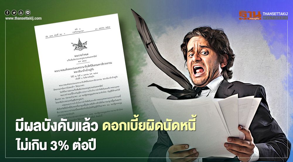 มาตรา 7 ถ้าจะต้องเสียดอกเบี้ยแก่กัน และมิได้กำหนดอัตราดอกเบี้ยไว้โดยนิติกรรมหรือโดยบทกฎหมายอันชัดแจ้ง ให้ใช้อัตราร้อยละสามต่อปี (3%ต่อปี) อัตราตามวรรคหนึ่งอาจปรับเปลี่ยนให้ลดลงหรือเพิ่มขึ้น เพื่อให้สอดคล้องกับสภาพเศรษฐกิจของประเทศได้โดยตราเป็นพระราชกฤษฎีกา โดยปกติให้กระทรวงการคลังพิจารณาทบทวนทุกสามปีให้ใกล้เคียงกับอัตราเฉลี่ยระหว่างอัตราดอกเบี้ยเงินฝาก กับอัตราดอกเบี้ยเงินให้กู้ยืมของธนาคารพาณิชย์