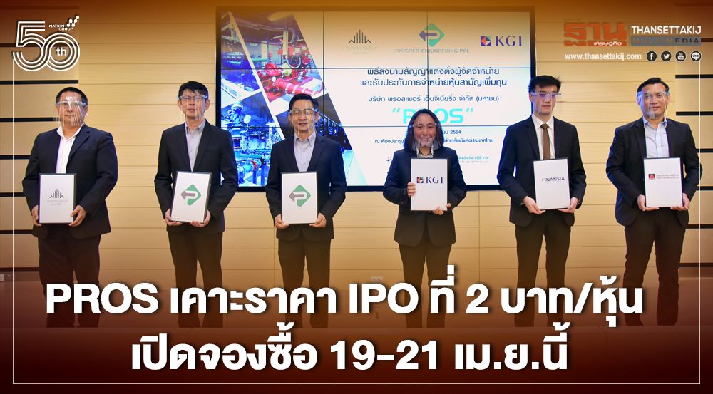 นางสาวพัชพร สรรคบุรานุรักษ์ กรรมการผู้จัดการ ฝ่ายวาณิชธนกิจ บริษัทหลักทรัพย์ เคจีไอ (ประเทศไทย) จำกัด (มหาชน) ในฐานะผู้จัดการการจัดจำหน่ายและรับประกันการจำหน่ายหุ้นสามัญเพิ่มทุนให้กับประชาชนทั่วไปครั้งแรก (IPO) ของบริษัท พรอสเพอร์ เอ็นจิเนียริ่ง จำกัด (มหาชน) หรือ PROS ผู้ให้บริการรับเหมาติดตั้งงานระบบวิศวกรรมประกอบอาคารรายใหญ่ของประเทศ เปิดเผยว่า บริษัทฯ ได้เสนอขายหุ้นสามัญให้กับประชาชนเป็นครั้งแรก (IPO) จำนวน 140 ล้านหุ้น มูลค่าที่ตราไว้ (พาร์) หุ้นละ 0.50 บาท กำหนดราคา IPO หุ้นละ 2 บาท ซึ่งถือเป็นระดับราคาที่น่าสนใจ เหมาะสมกับปัจจัยพื้นฐานและศักยภาพการเติบโตอย่างต่อเนื่องของบริษัทฯ กำหนดวันเปิดให้จองซื้อหุ้น IPO ระหว่างวันที่ 19-21 เมษายน 2564