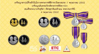 เหรียญเฉลิมพระเกียรติพระราชพิธีสถาปนาสมเด็จพระนางเจ้าสุทิดา พัชรสุธาพิมลลักษณ พระบรมราชินี 4 พฤษภาคม 2562 (เหรียญที่ระลึกประดับแพรแถบ) ชนิดบุรุษและสตรี จำหน่ายราคาเหรียญละ 1,600 บาท โดยเปิดจำหน่ายแล้ว ตั้งแต่บัดนี้เป็นต้นไป
