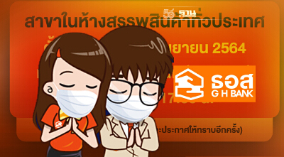 ธอส. แจ้งปรับเวลาเปิดให้บริการ สาขาในห้างสรรพสินค้าทั่วประเทศ ตั้งแต่วันที่ 4 ก.ย. 64 เป็นต้นไป จนกว่าจะมีคำสั่งเปลี่ยนแปลง