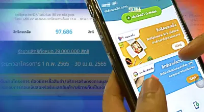 และมียอดใช้จ่ายสะสมแบ่งตามประเภทตามร้านค้า ได้แก่ ร้านอาหารและเครื่องดื่ม 6,903.3 ล้านบาท ร้านธงฟ้า 3,593.7 ล้านบาท ร้าน OTOP 884.1 ล้านบาท ร้านค้าทั่วไป 6,782.2 ล้านบาท ร้านบริการ 320.6 ล้านบาท และกิจการขนส่งสาธารณะ 26.7 ล้านบาท