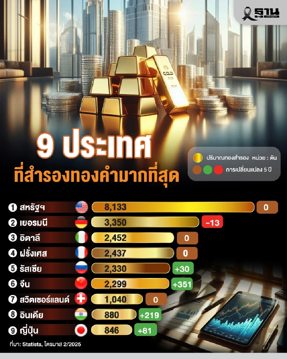 จากข้อมูลล่าสุดของ Statista แพลตฟอร์มข้อมูลและธุรกิจอัจฉริยะระดับโลก แสดงสถานะการสะสมทองคำของประเทศต่างๆ ในไตรมาสที่ 2 ของปี 2025 พบว่า สหรัฐอเมริกายังคงเป็นผู้นำประเทศที่มีการสำรองทองคำมากที่สุดในโลก โดยมีการสำรองทั้งหมด 8,133 ตัน