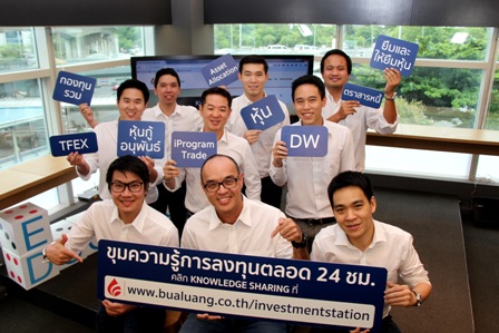 นายบรรณรงค์ พิชญากร กรรมการผู้จัดการ กิจการค้าหลักทรัพย์ พร้อมด้วยทีมกูรูผู้เชี่ยวชาญด้านผลิตภัณฑ์ต่างๆของ บมจ.หลักทรัพย์ บัวหลวง ร่วมเปิดตัว Bualuang Knowledge Sharing ขุมความรู้ด้านการลงทุนออนไลน์ตลอด 24 ชั่วโมง ที่ www.bualuang.co.th/investmentstation เพื่อให้เป็นศูนย์รวมของข้อมูลความรู้ด้านการลงทุนพร้อมข้อมูลอัพเดทรายวันจากผู้เชี่ยวชาญ